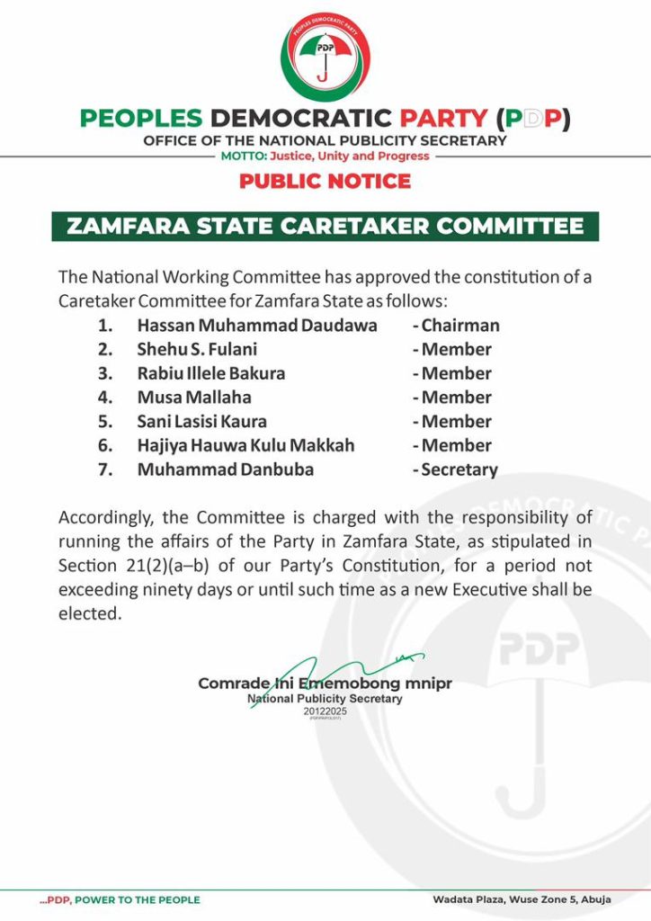 The factional National Working Committee (NWC) of the Peoples Democratic Party (PDP) has approved a Caretaker Committee for Zamfara State PDP, led by Hassan Muhammad Daudawa as Chairman.
